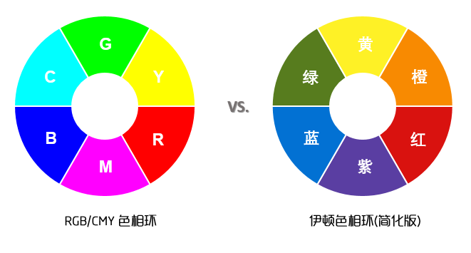 而美术课用的三原色红黄蓝,生成的一级间色是绿、橙、紫。可以视作一个伊顿色相环的6色简化版。